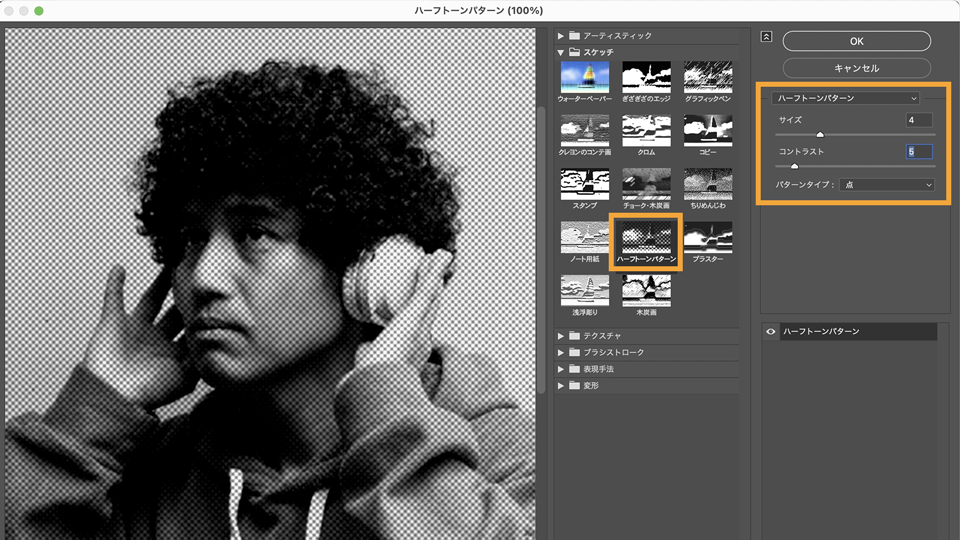 フィルターカテゴリから「スケッチ」→「ハーフトーンパターン」を選択し、右側のプロパティパネルで「サイズ:4、コントラス:5、パターンタイプ:点」に設定し「OK」をクリックすると、画像にモノクロのハーフトーンパターンが適⽤されます。