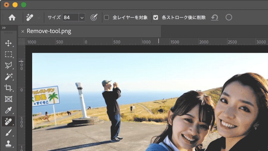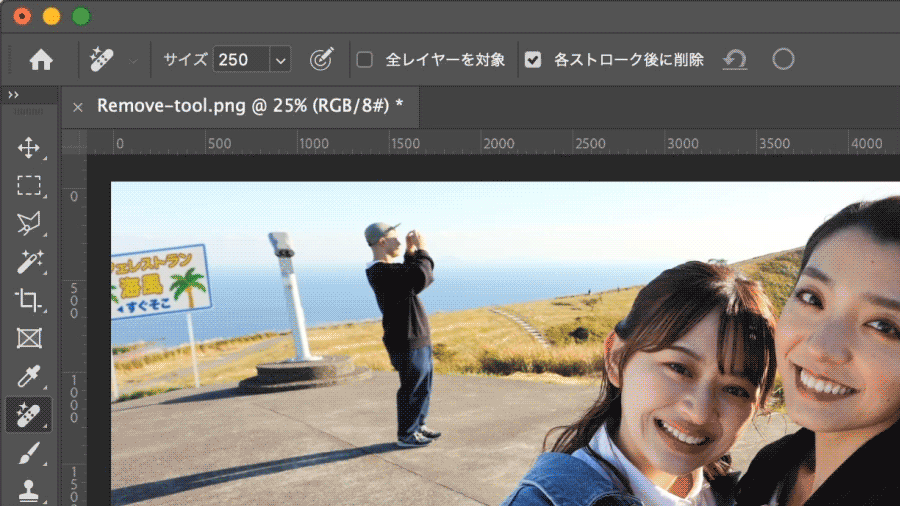 写真の中に映り込んでいる⼩さな⼈物をクリックすると、即座に⼈物が削除されます。同様に他の⼈物と、写真右上の鉄塔を削除していきます。