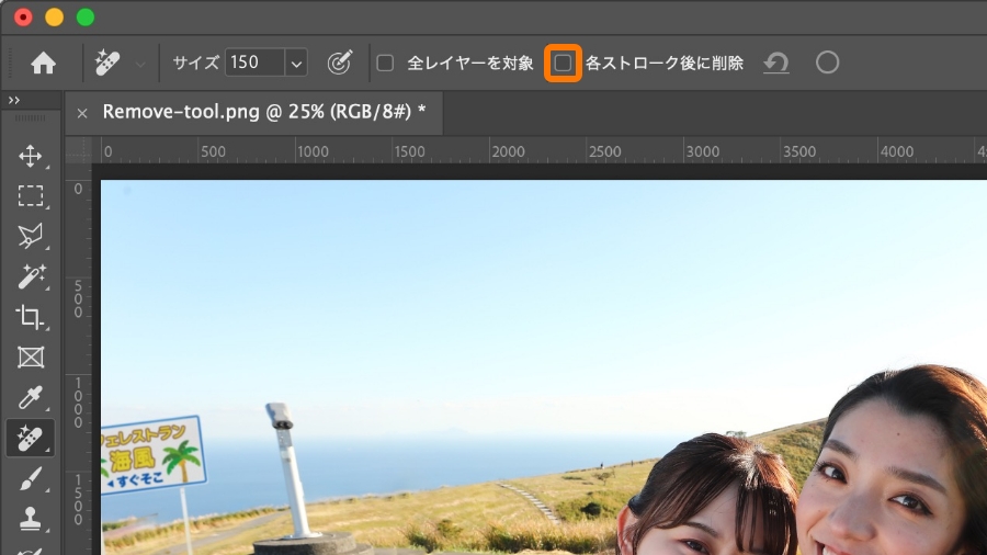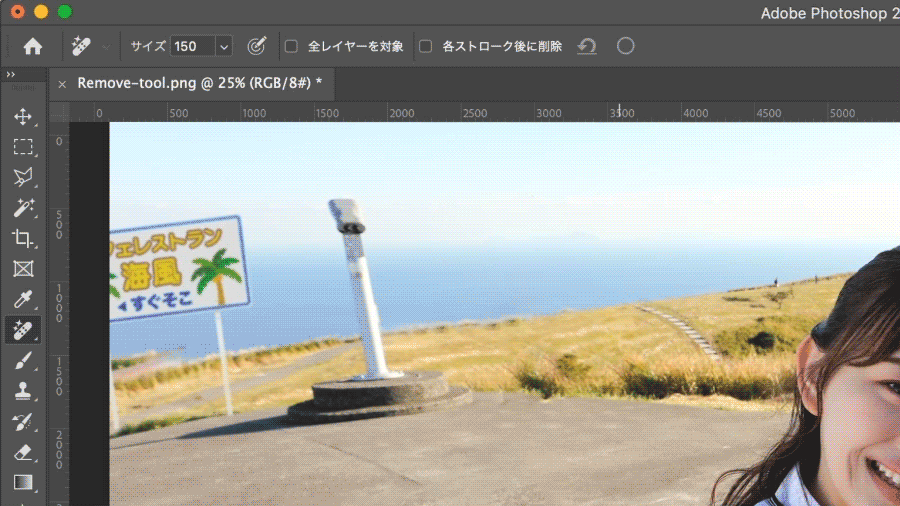 最後に看板と望遠鏡を削除します。ここでは、1度のブラシストロークではなく、複数回のストロークで削除していきます。オプションツールバーの[各ストローク後に削除]のチェックを外し、ブラシサイズを150pxに設定します。