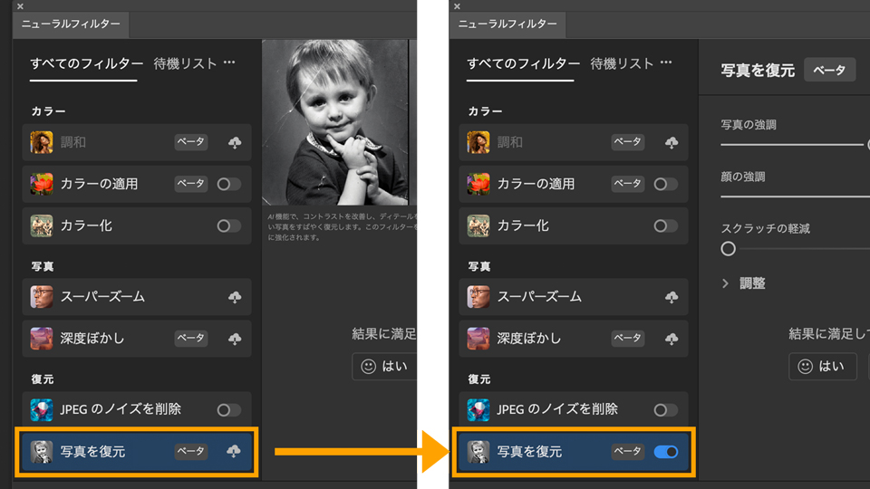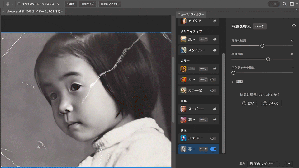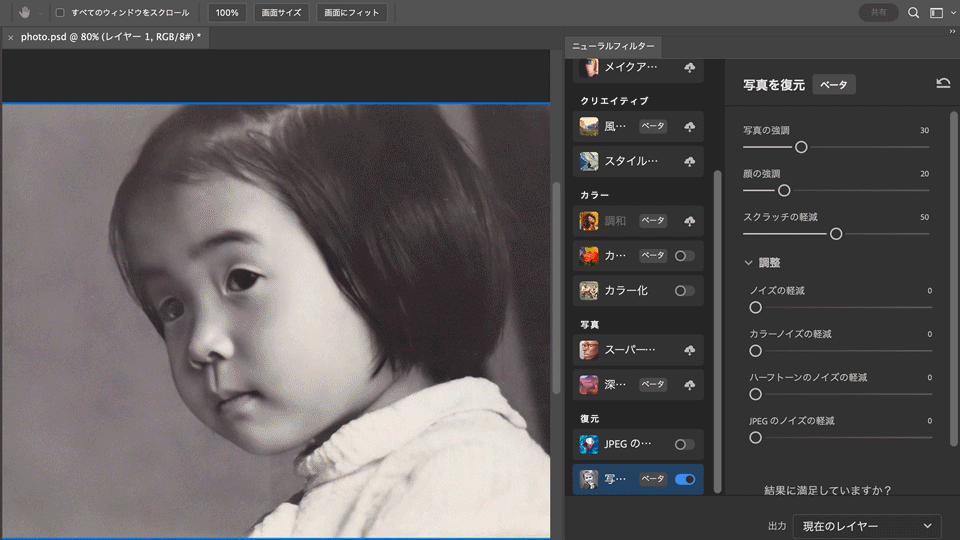 Photoshopのニューラルフィルター「写真を復元」(ベータ)を使⽤すると、損傷した古い写真をきれいに復元することができます。傷や折れ曲がり跡がついた写真でも、スライダーを動かすだけで簡単に修復できます。まずは下の動画で⼀連の制作⼯程を確認してください。