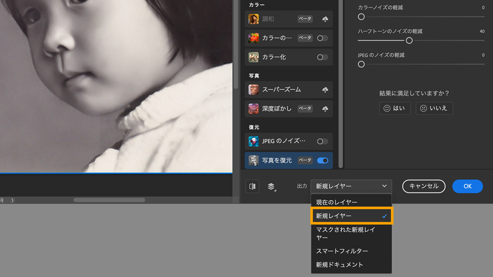 新規レイヤー :ニューラルフィルターによって⽣成されたピクセルのみ、新規レイヤーとして出⼒されます。