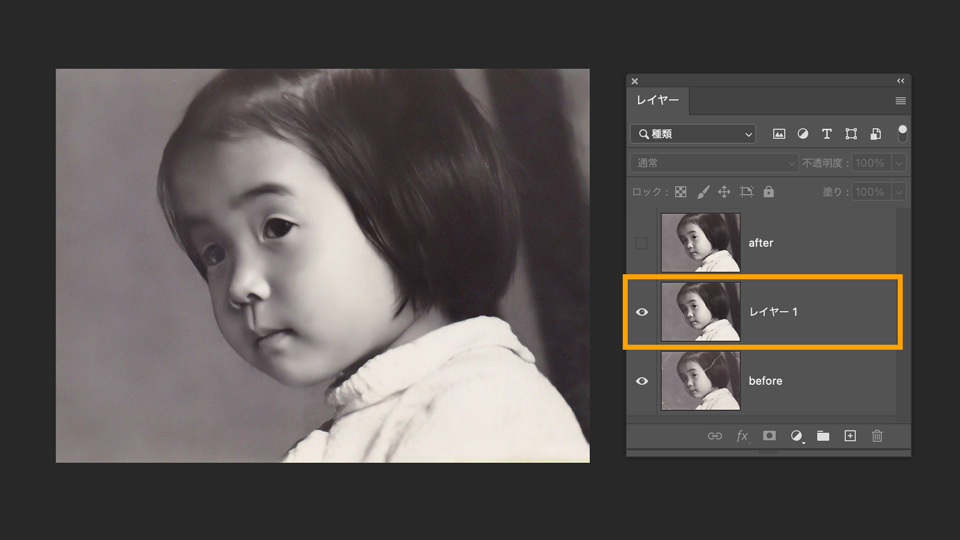 ※「after」レイヤーは完成サンプルとなりますので、編集中は⾮表⽰のままにしておきます。