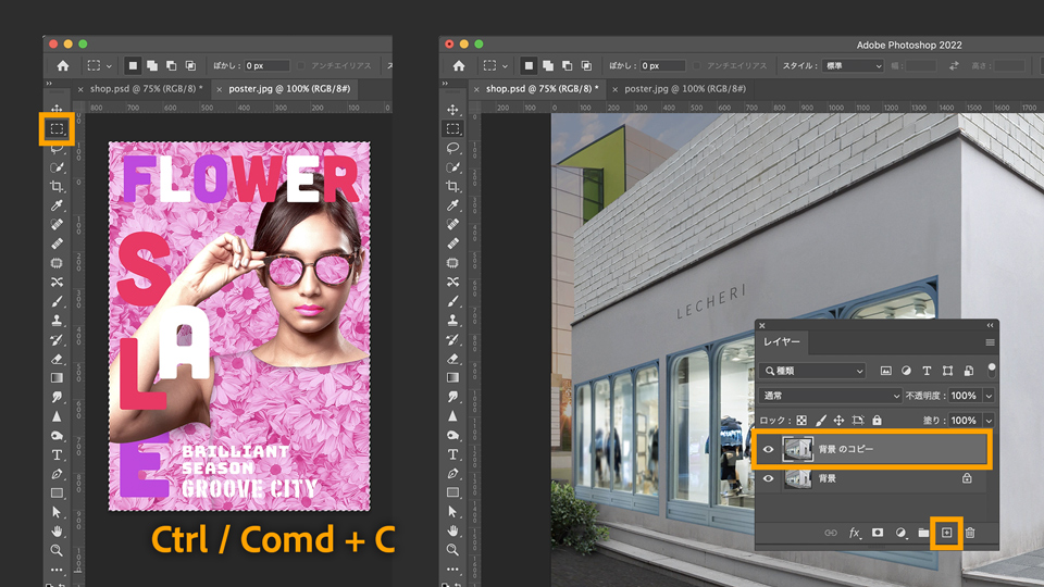 Photoshopを起動し、「ファイル」→「開く」から練習⽤サンプルファイルの「poster.jpg」を選択して開きます。ポスターのデザインが表⽰されるので、⻑⽅形選択ツールをドラッグして全てを選択し、「Control/Command + C」でコピーしておきます。