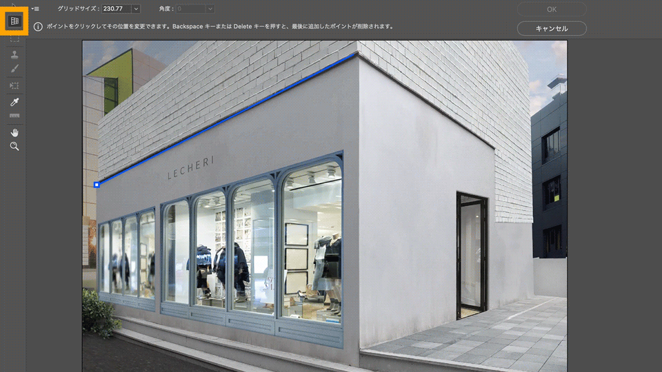 「背景のコピー」レイヤーを選択した状態で、「フィルター」→「消点」から「消点」ワークスペースを開きます。