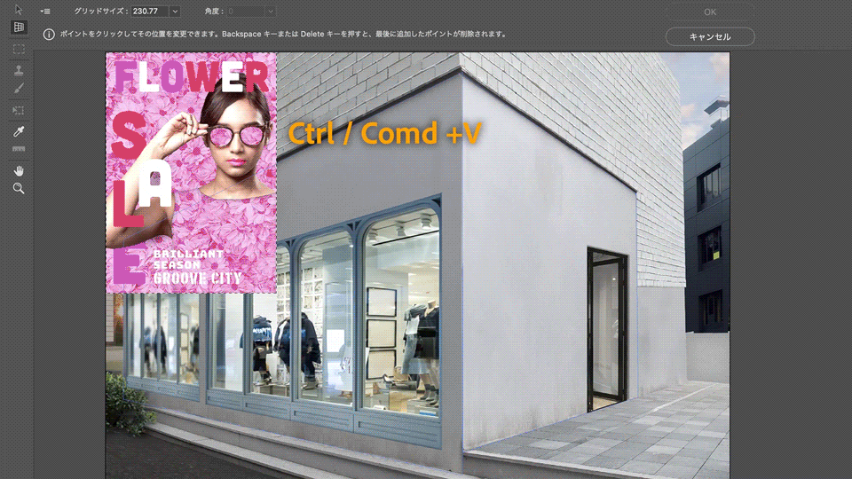 今度は、ポスターを「alt/option」キーを押しながら⾓をまたいで右側の壁⾯へドラッグすると、⾯のパースに合わせて⾃動的に変形しながら複製されます。壁⾯に合わせて⼤きさと位置を調整します。ポスターを貼り終わったら「OK」をクリックしてワークスペースを閉じます。