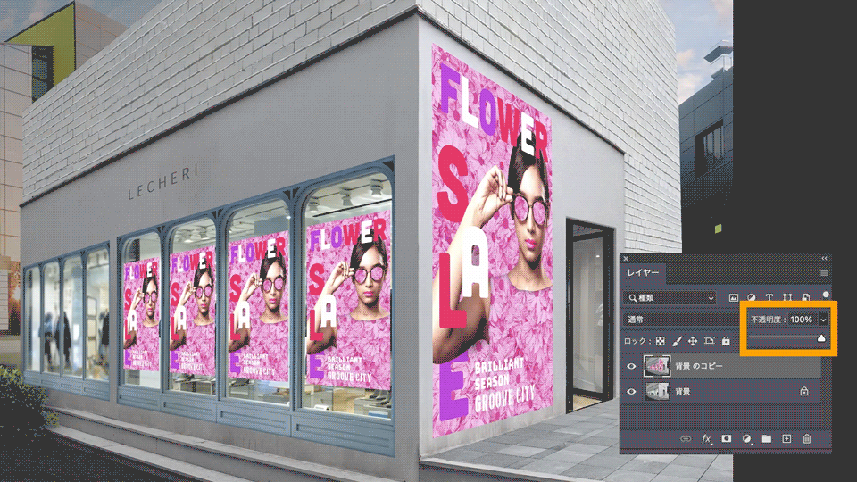 レイヤーパネルで「背景のコピー」レイヤーの透明度を90%に設定します。こうすることで、ポスターが窓ガラスや壁に⾃然に馴染んだように⾒せることができます。