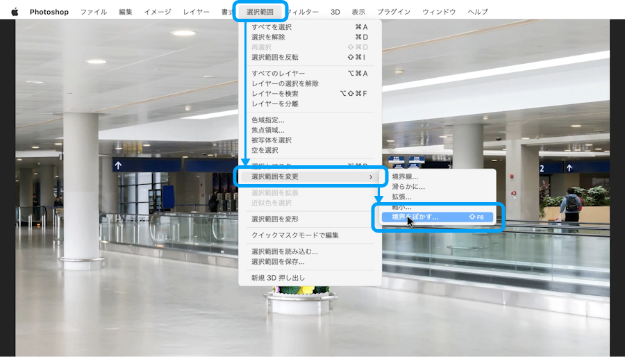 メニューの[選択範囲]→[選択範囲の変更]→[境界をぼかす]を選択します。