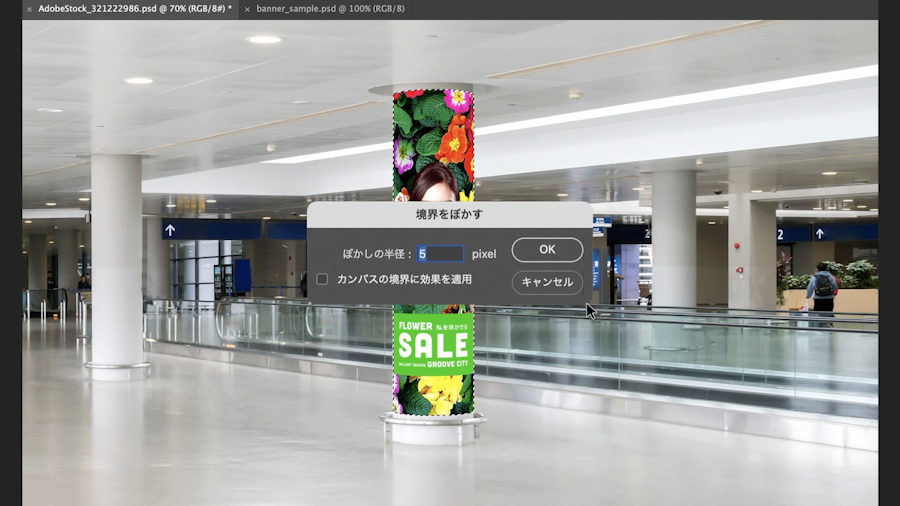 「境界線をぼかす」ダイアログボックスが表⽰されたら、ぼかしの半径を「5pixel」に設定し、「OK」をクリックします。