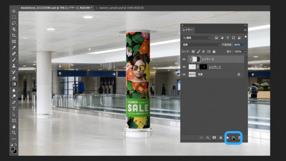 ポスター画像(レイヤー1)が選択された状態で、レイヤーパネルの下の「ベクトルマスクを追加」ボタンをクリックして、レイヤーマスクを作成します。