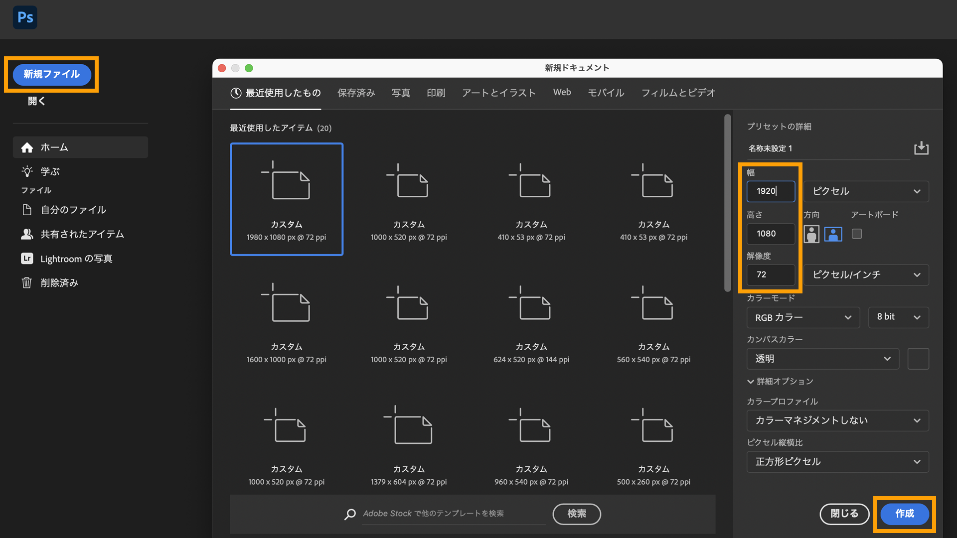 「新規ドキュメント」画⾯で「幅:1920、⾼さ:1080、解像度:72」に設定し、「作成」をクリックします。