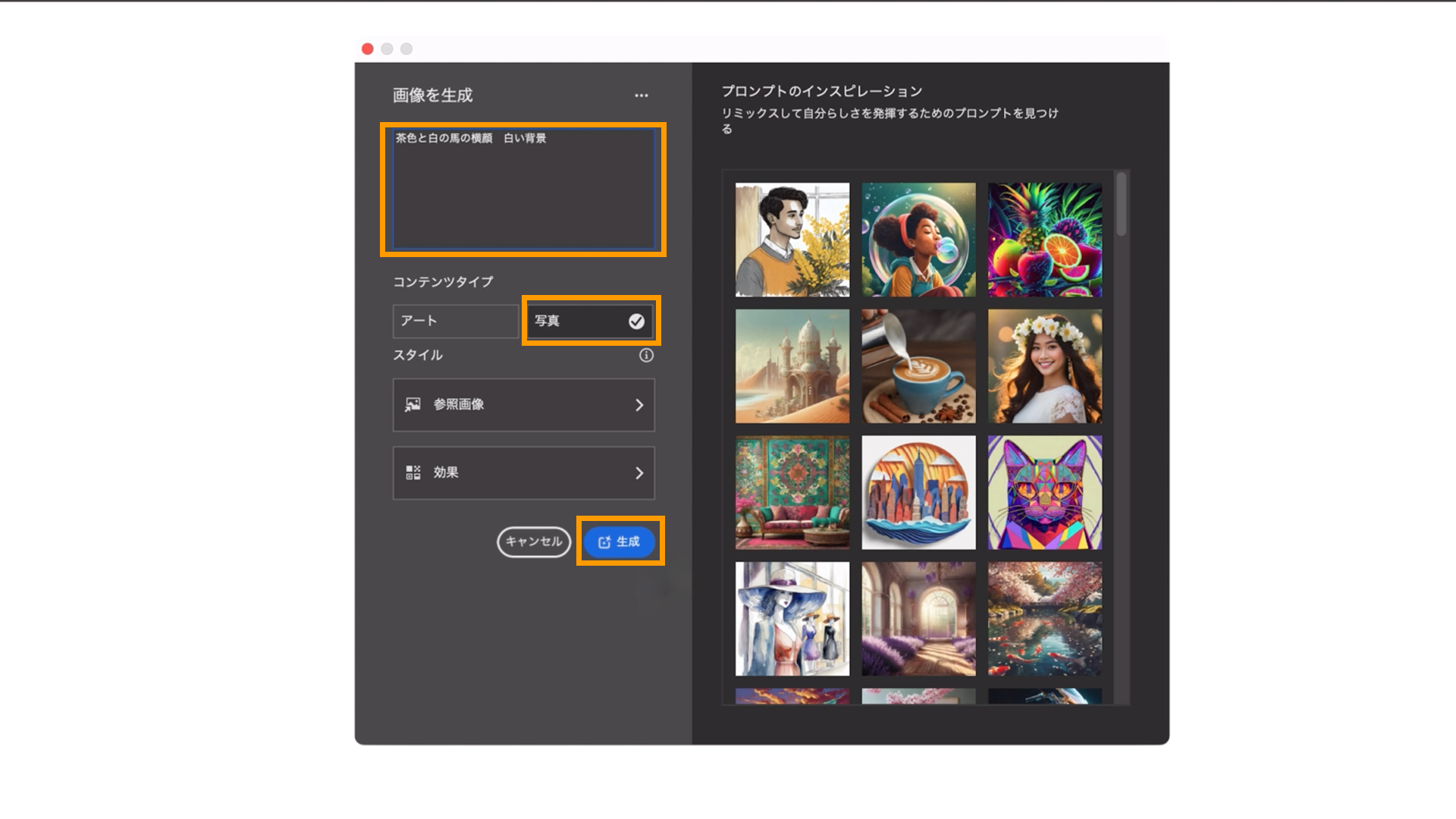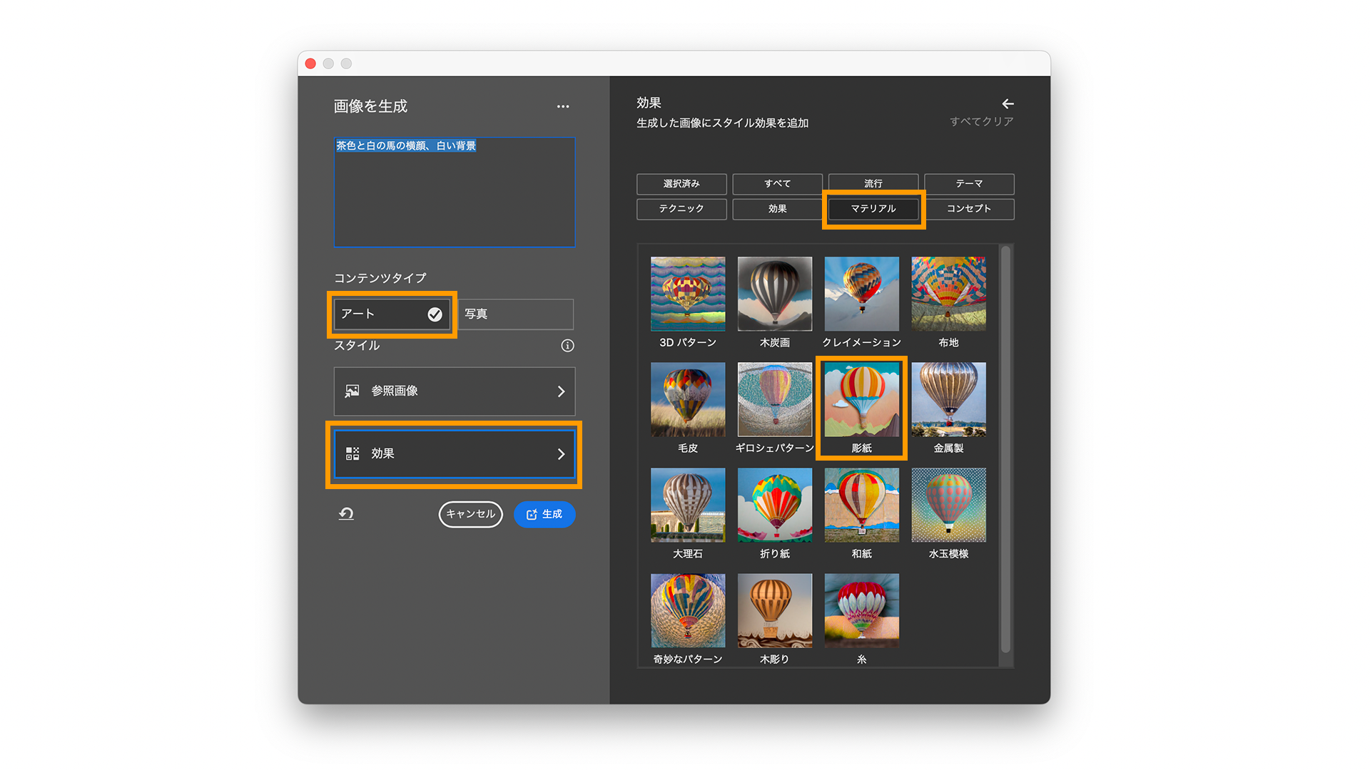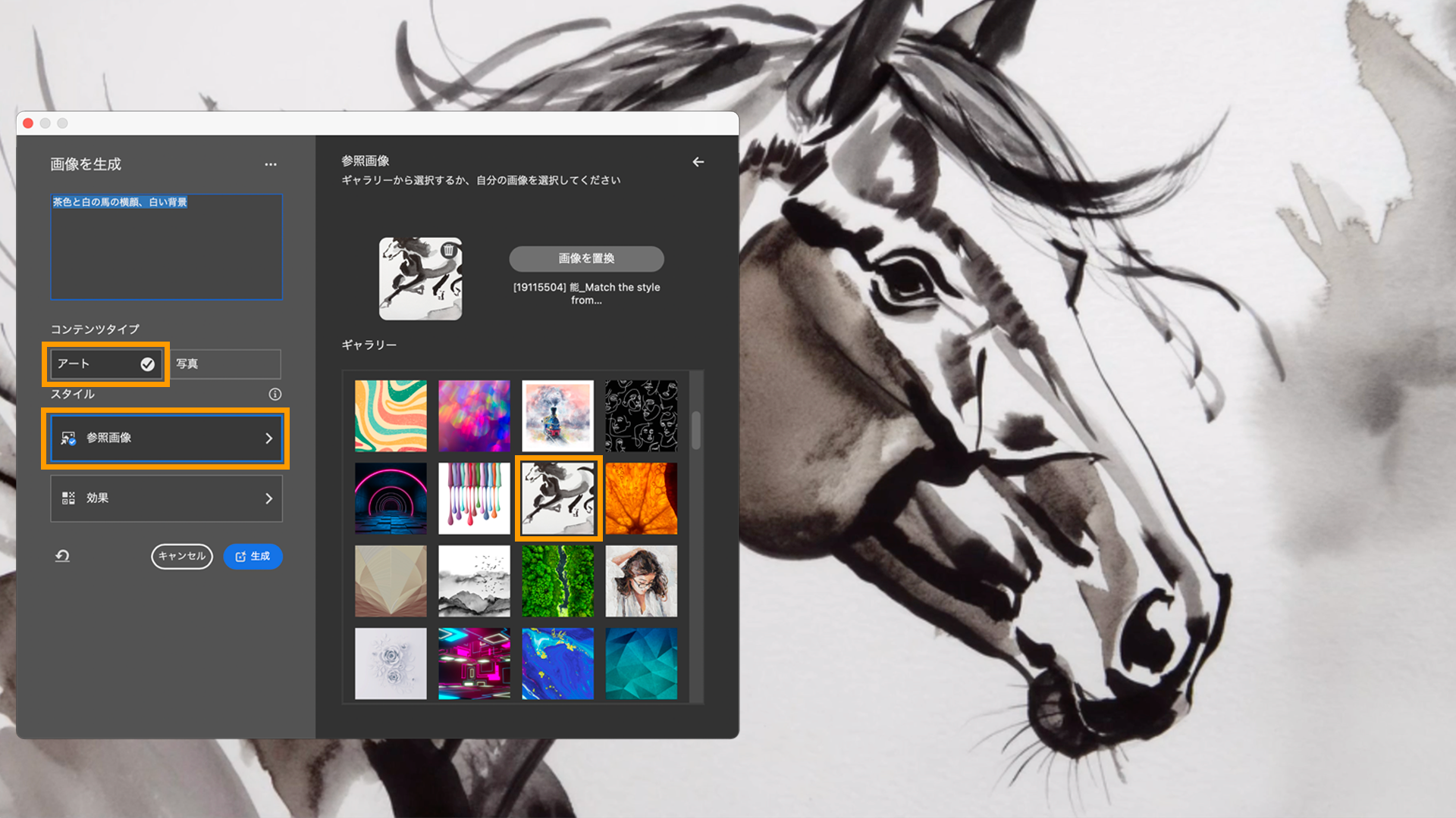 「画像を⽣成」ウィンドウが開いたら、テキストプロンプトフィールドに先ほどと同じく「茶⾊と⽩の⾺の横顔 ⽩い背景」と⼊⼒します。今度はコンテンツタイプの「アート」をクリックして選択します。