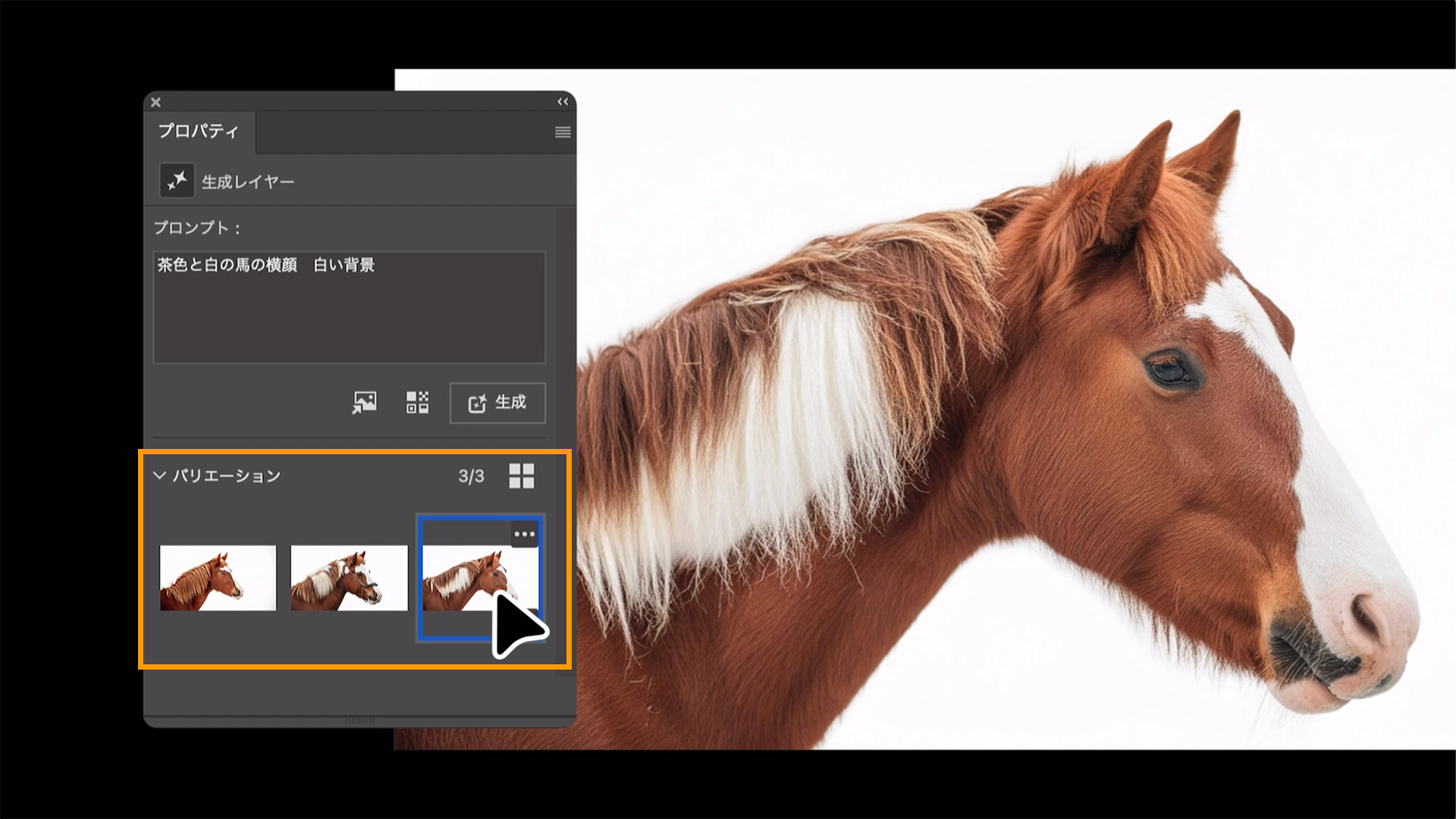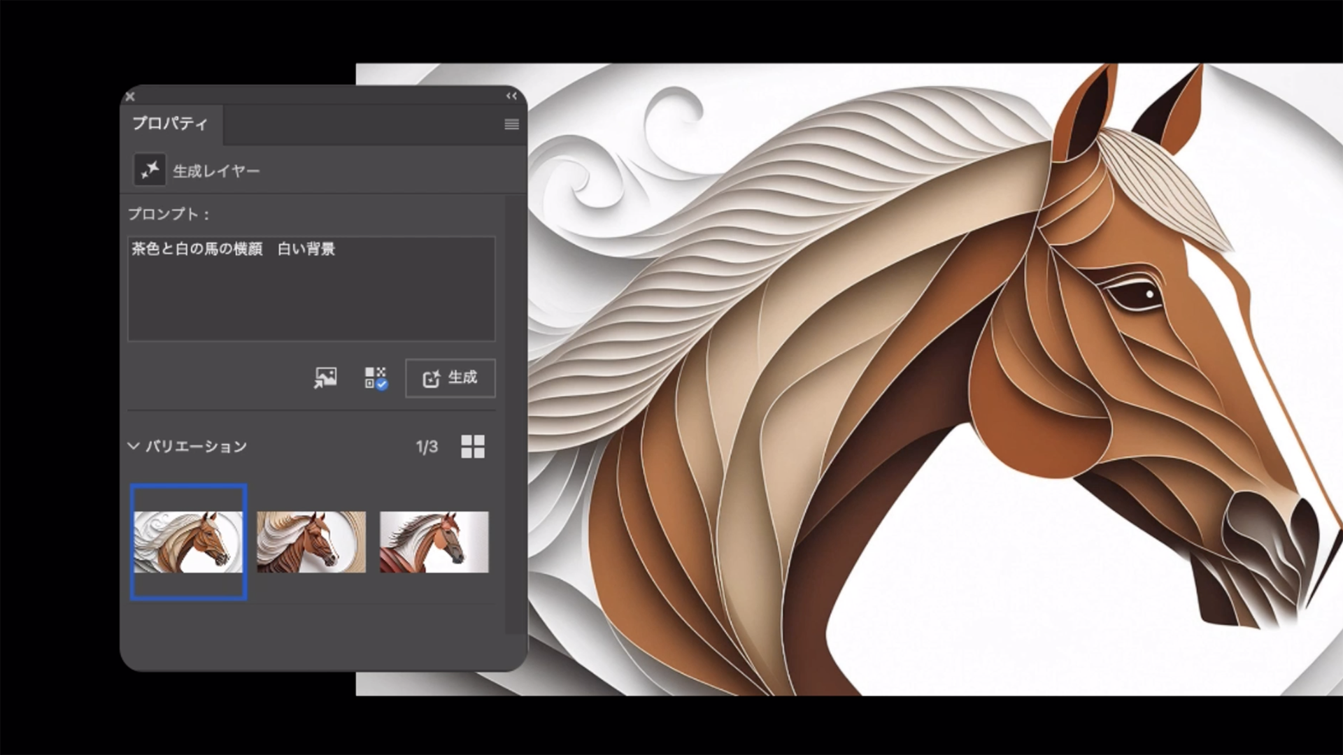 「画像を⽣成」ウィンドウが開いたら、テキストプロンプトフィールドに「茶⾊と⽩の⾺の横顔⽩い背景」と⼊⼒します。