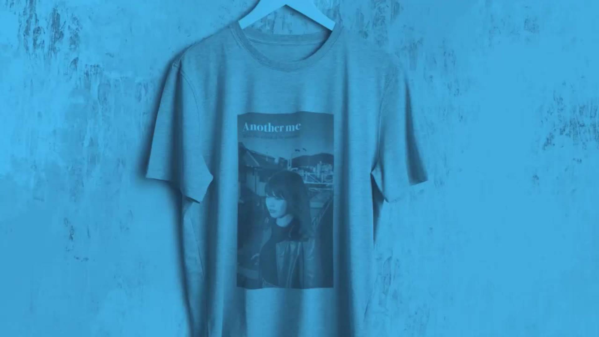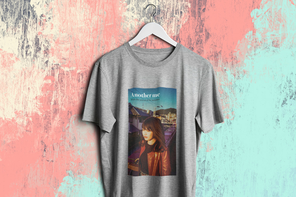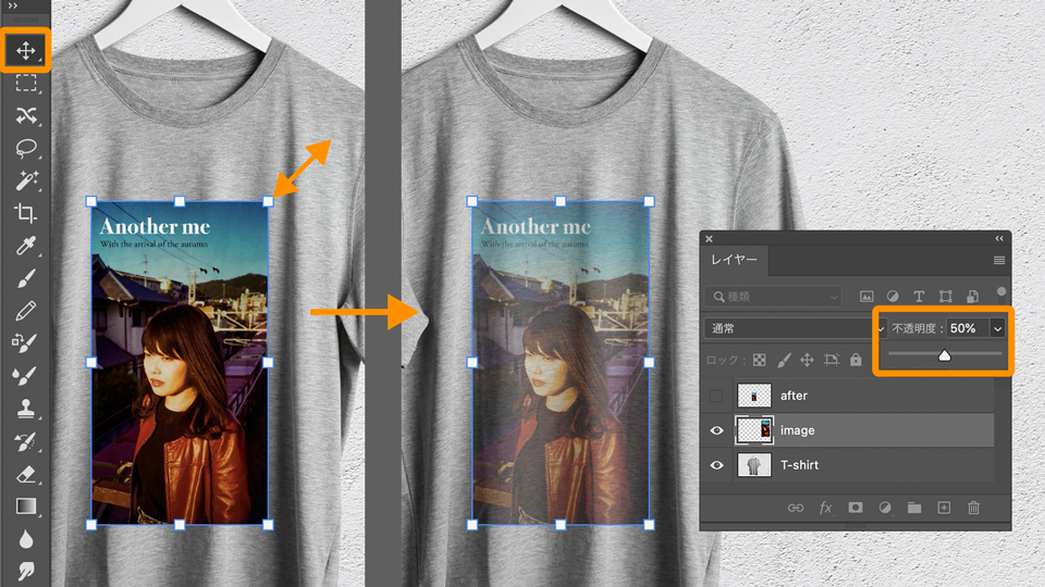 「移動ツール」でポートレイトをTシャツの上に移動し、バウンディングボックスのコーナーポイントをドラッグして⼤きさを調整しながら、Tシャツの中央に配置します。