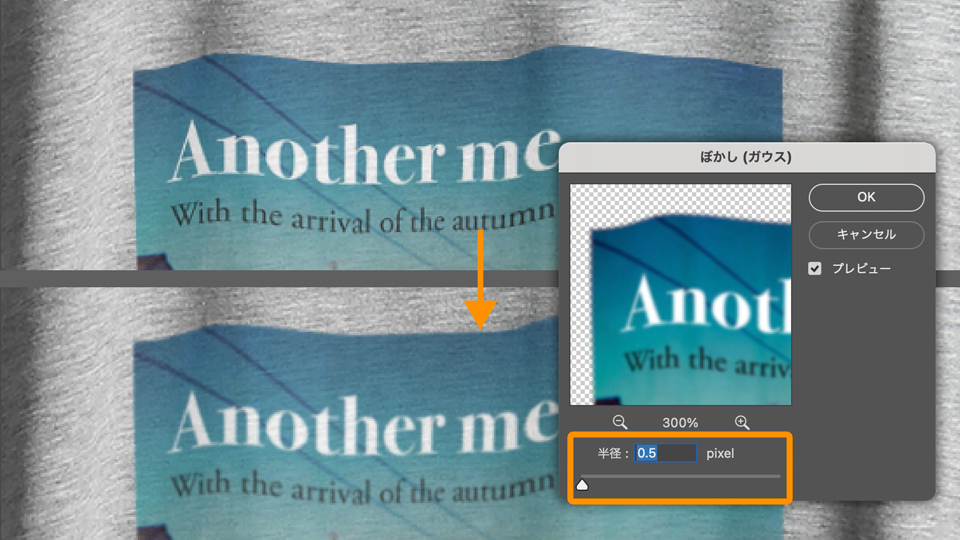 「image」レイヤーを選択した状態で、「フィルター」→「ぼかし」→「ぼかし(ガウス)」を選択します。「ぼかし(ガウス)」ウィンドウで「半径」を0.5に設定し、「OK」をクリックします。配置したポートレイトの画像がTシャツに馴染み、より⾃然な仕上がりになります。