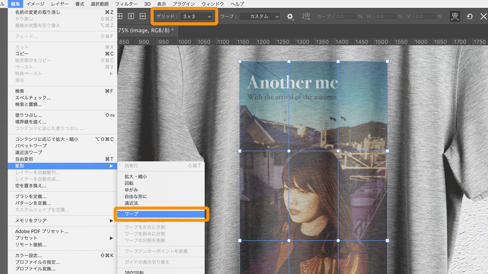 「image」レイヤーを選択し、「編集」→「変形」→「ワープ」を選択します。