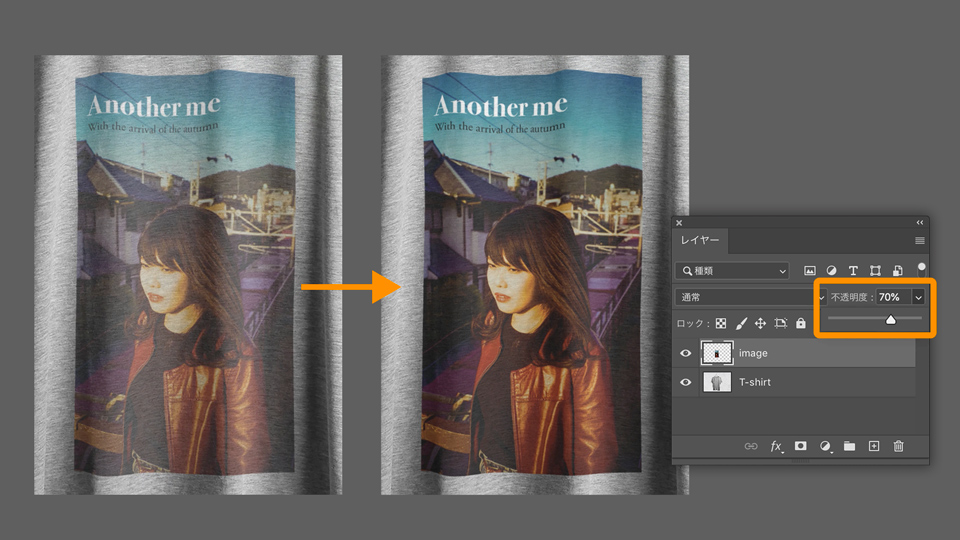 画像の変形が終わったら、オプションバーにある「◯(変形を確定)」ボタンをクリックし、レイヤーパネルで「image」レイヤーの不透明度を70%にします。