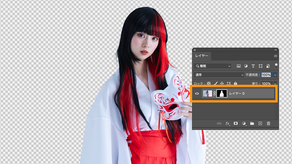 背景が一瞬で削除されて透明になります。レイヤーパネルを表示させると、レイヤーマスクで人物が切り抜かれていることがわかります。