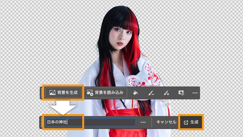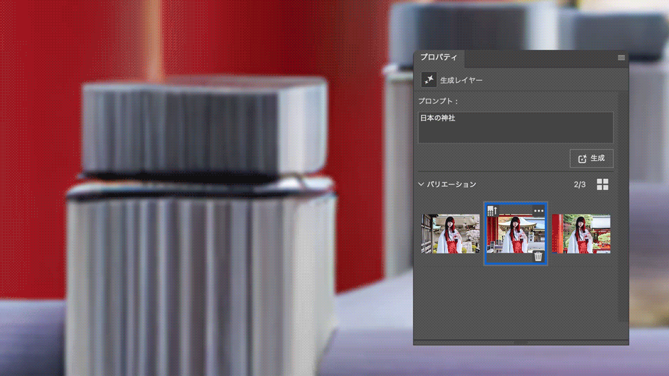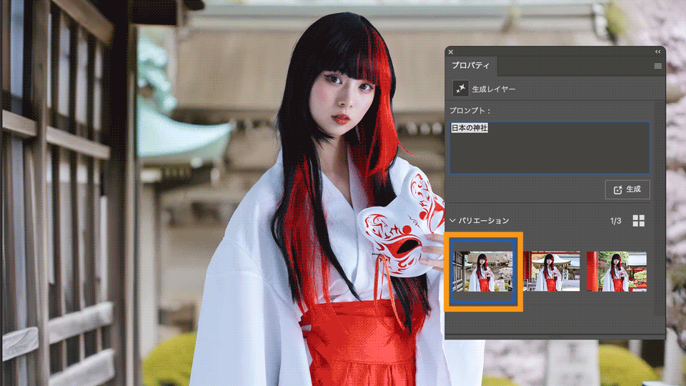 次に、コンテキストタスクバーの「背景を生成」をクリックし、プロンプトに「日本の神社」と入力して「生成」をクリックします。