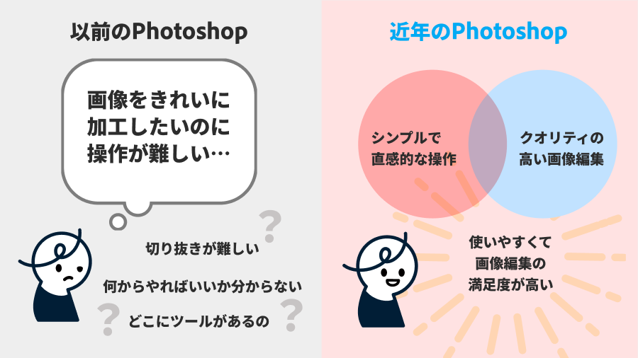 以前Photoshopを使っていて「操作が難しい」「機能が多すぎる」と感じた方でも、最新バージョンではシンプルな操作でクオリティの高い画像編集ができるようになっています。