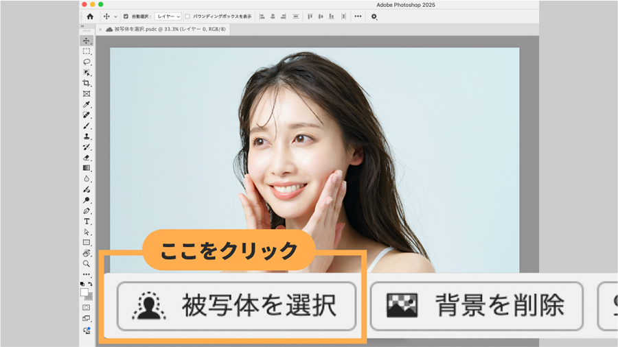 使い方はとても簡単です。Photoshop起動後、切り抜きたい画像を開きます。画像の下部に「被写体を選択」というボタンが表示されています。