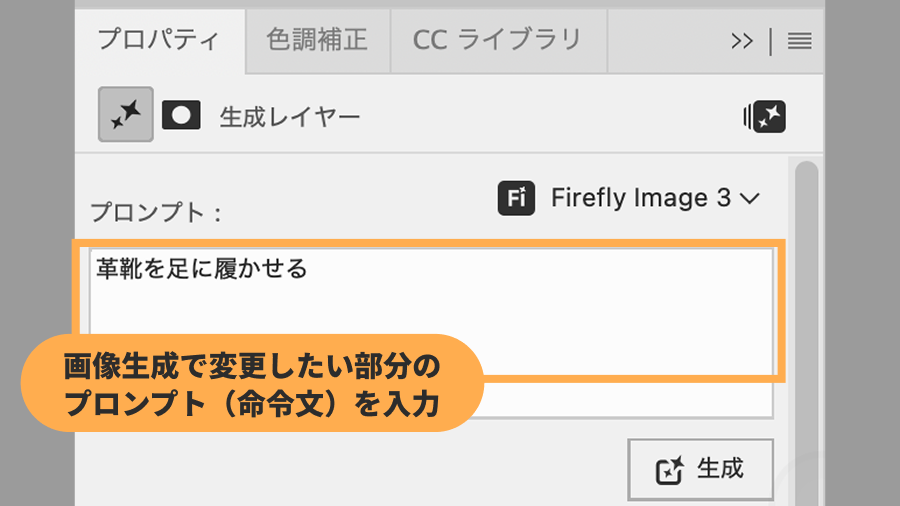 こんな場合も簡単な命令文(プロンプト)をPhotoshopに入力すれば、さまざまな靴を履かせることができます。選択ブラシツールや他の選択ツールを使い、靴を履かせたい領域を選択します。コンテキストタスクバーに表示される「生成塗りつぶし」ボタンをクリックします。