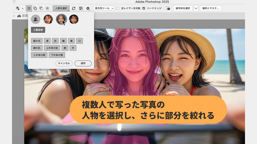 「オブジェクト選択」ツールは、特定の人物とパーツを選択して、部分的に色を変更します。複数人が写真に写っている場合でも、特定の人物のみを加工できます。