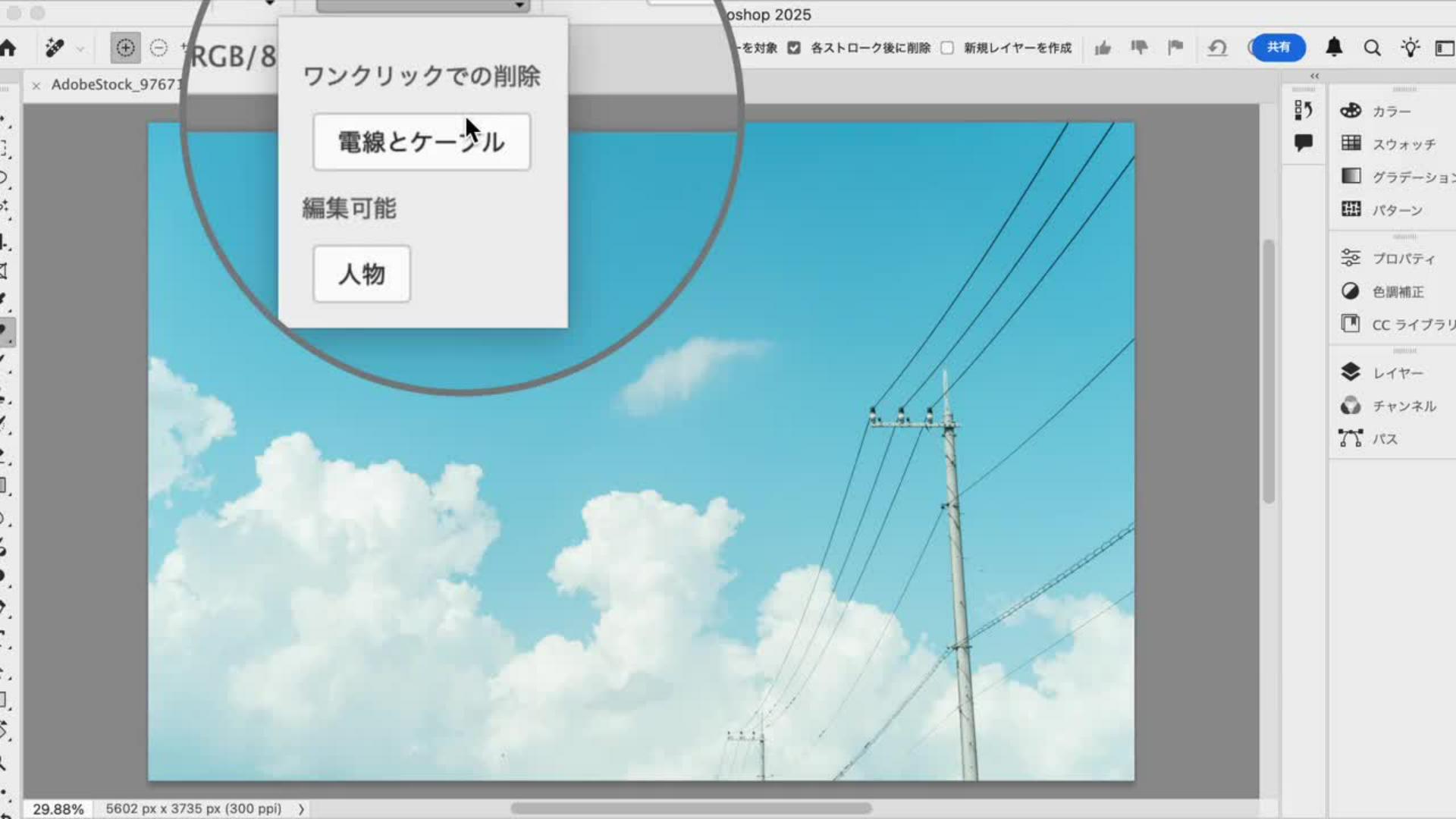 空の写真は四季おりおりに撮影したくなるものですが、電線が映り込んで困ったことはありませんか?「削除」ツールを使うことで、撮影した不要な物体を自然に除去でき、理想の仕上がりに近づけることができます。