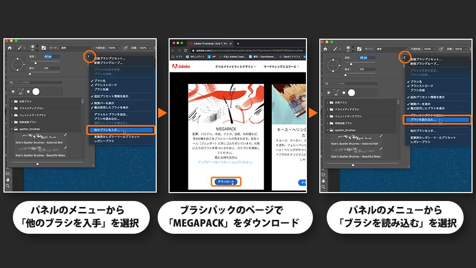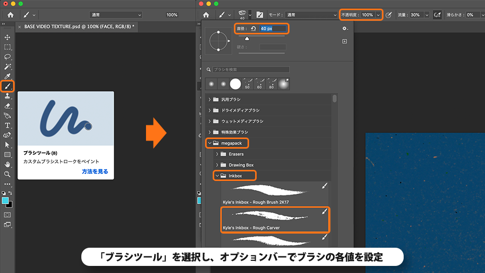 ここでは、「Kyle's Inkbox-Rough Carver」というブラシを使用しています。Photoshopで は製品にあらかじめ組み込まれたブラシの他に、お好みのブラシをダウンロードして追加することができます。Kyle's Inkbox-Rough Carverは、Kyle T.Webster 氏によるカスタムブラシで、Adobeのサイトから入手することができます。ダウンロードサイトは、 Photoshop から開くことができ、以下の手順で入手できます。