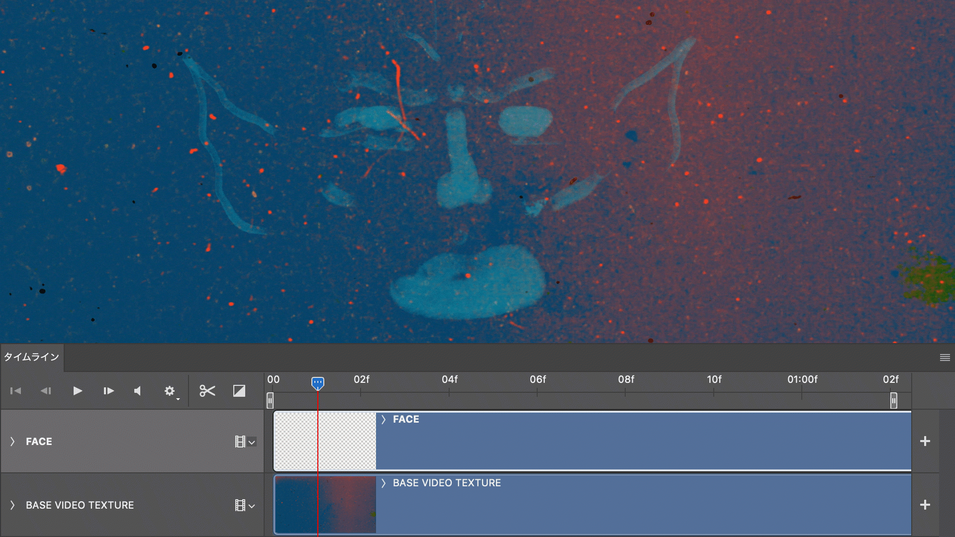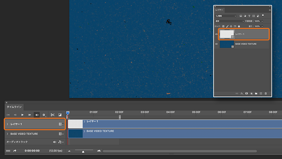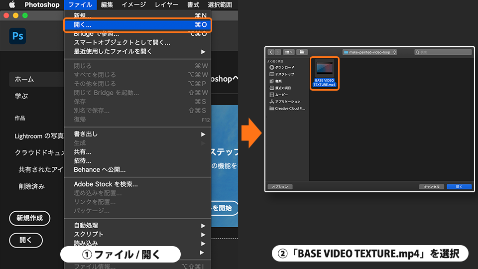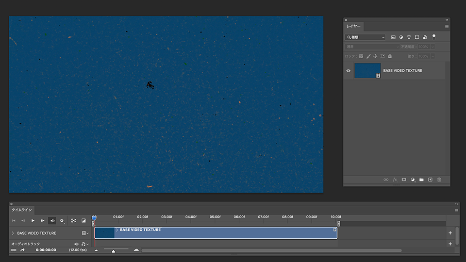 Photoshop を起動し、「ファイル」-「開く」から練習用サンプルファイル「BASE VIDEO TEXTURE.mp4」を選択して開きます。