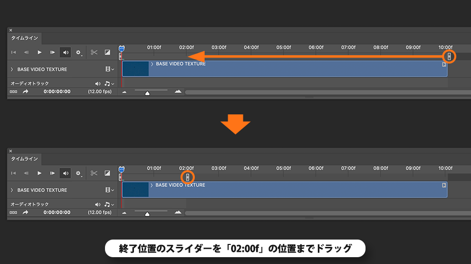 終了位置のスライダーを「02:00f」の位置までドラッグしてワークエリアを縮めます。
