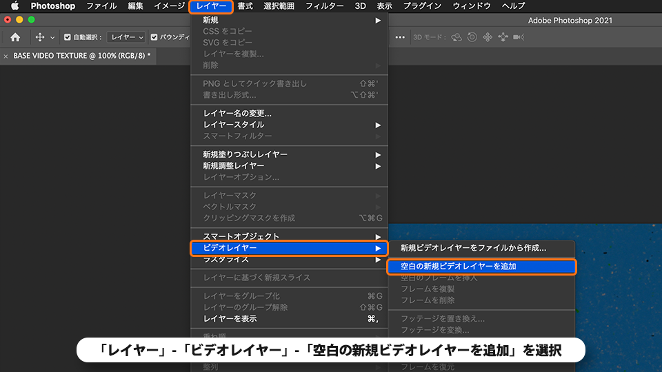 メニューバーの「レイヤー」-「ビデオレイヤー」-「空白の新規ビデオレイヤーを追加」を選択します。