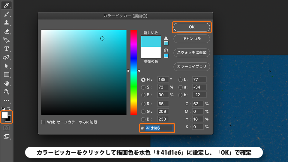 カラーピッカーをクリックして描画色を水色「# 41d1e6」に設定し、「OK」で確定します。