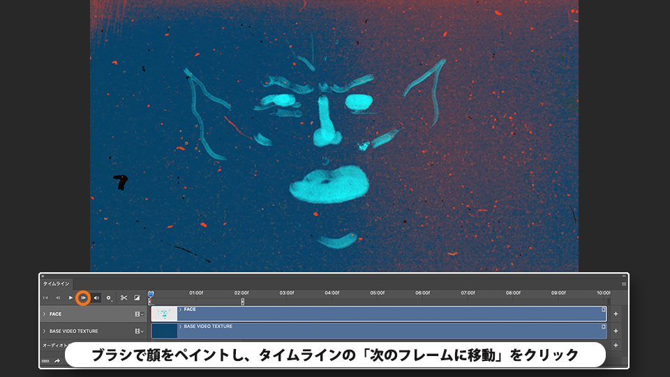 ブラシで顔をペイントし、タイムラインの「次のフレームに移動」をクリックします。