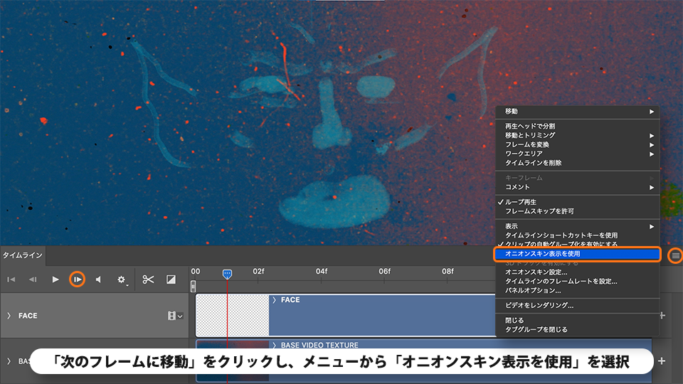 タイムラインのパネルメニューから「オニオンスキン表示を使用」をクリックします。