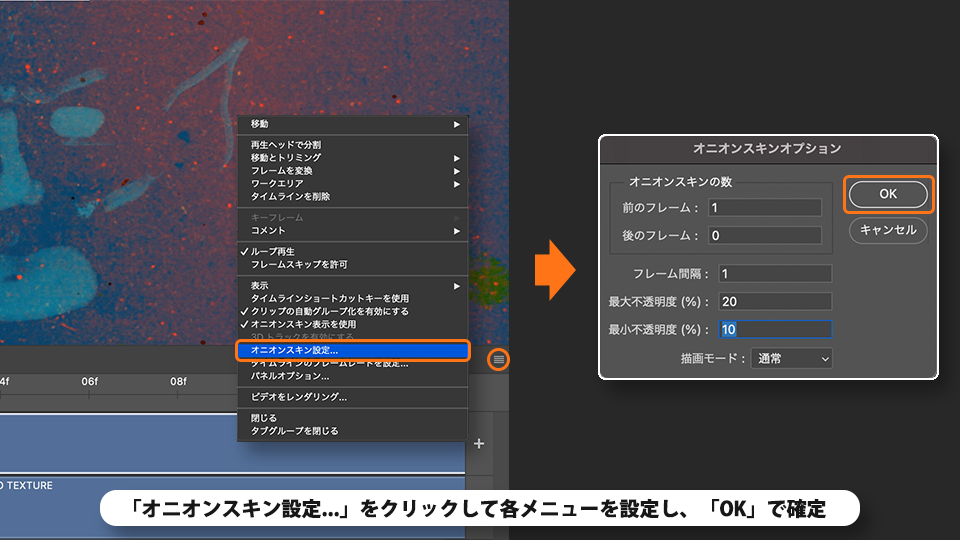 タイムラインのパネルメニューから「オニオンスキン設定...」をクリックします。