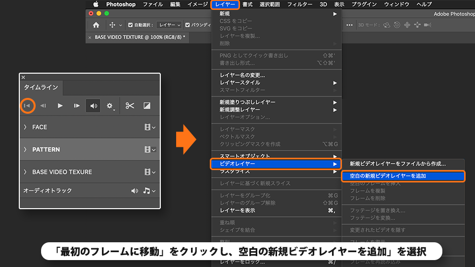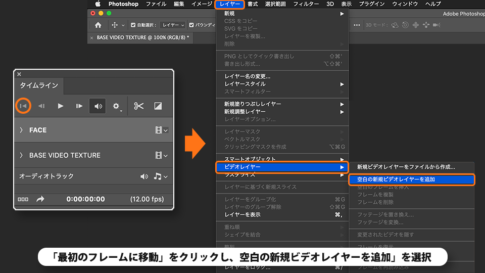 「最初のフレームに移動」をクリックします。 メニューバーの「レイヤー」-「ビデオレイヤー」-「空白の新規ビデオレイヤーを追加」を選択します。