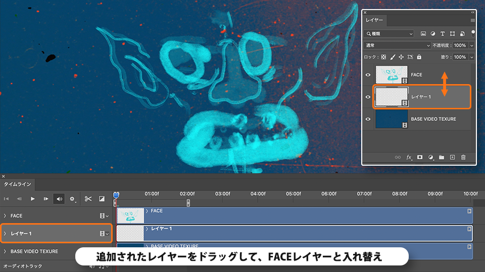 追加されたレイヤーをドラッグして、FACE の下に移動します。