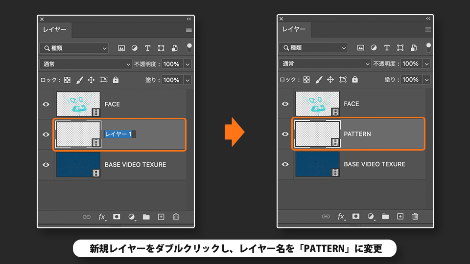 追加されたレイヤーの名前の部分をダブルクリックし、レイヤー名を「PATTERN」に変更します。