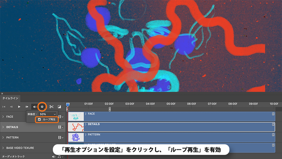 タイムラインで「再生オプションを設定」をクリックし、「ループ再生」を有効にします。