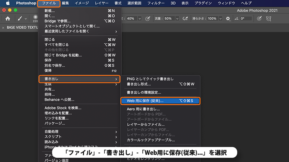 メニューバーの「ファイル」-「書き出し」-「Web 用に保存(従来)...」を選択します。