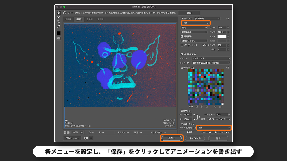 各メニューを以下に設定し、「保存」をクリックして無限にループするアニメーションを書き出します。