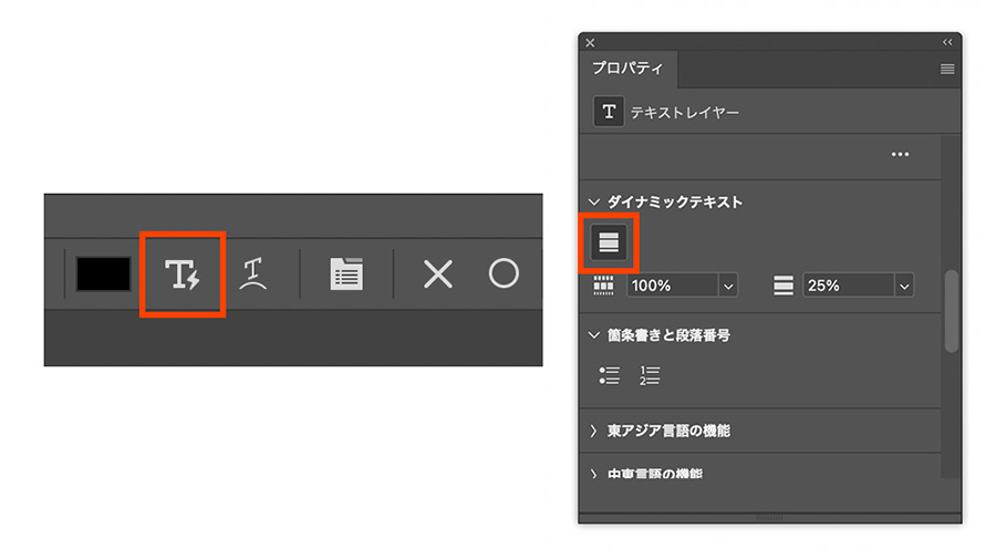 ② テキストボックスが選択された状態で、上部のオプションバー、またはプロパティパネルから「ダイナミックテキスト」のアイコンをオンにする