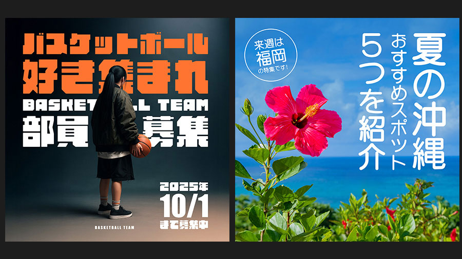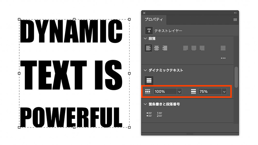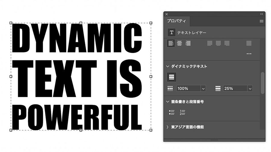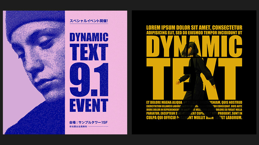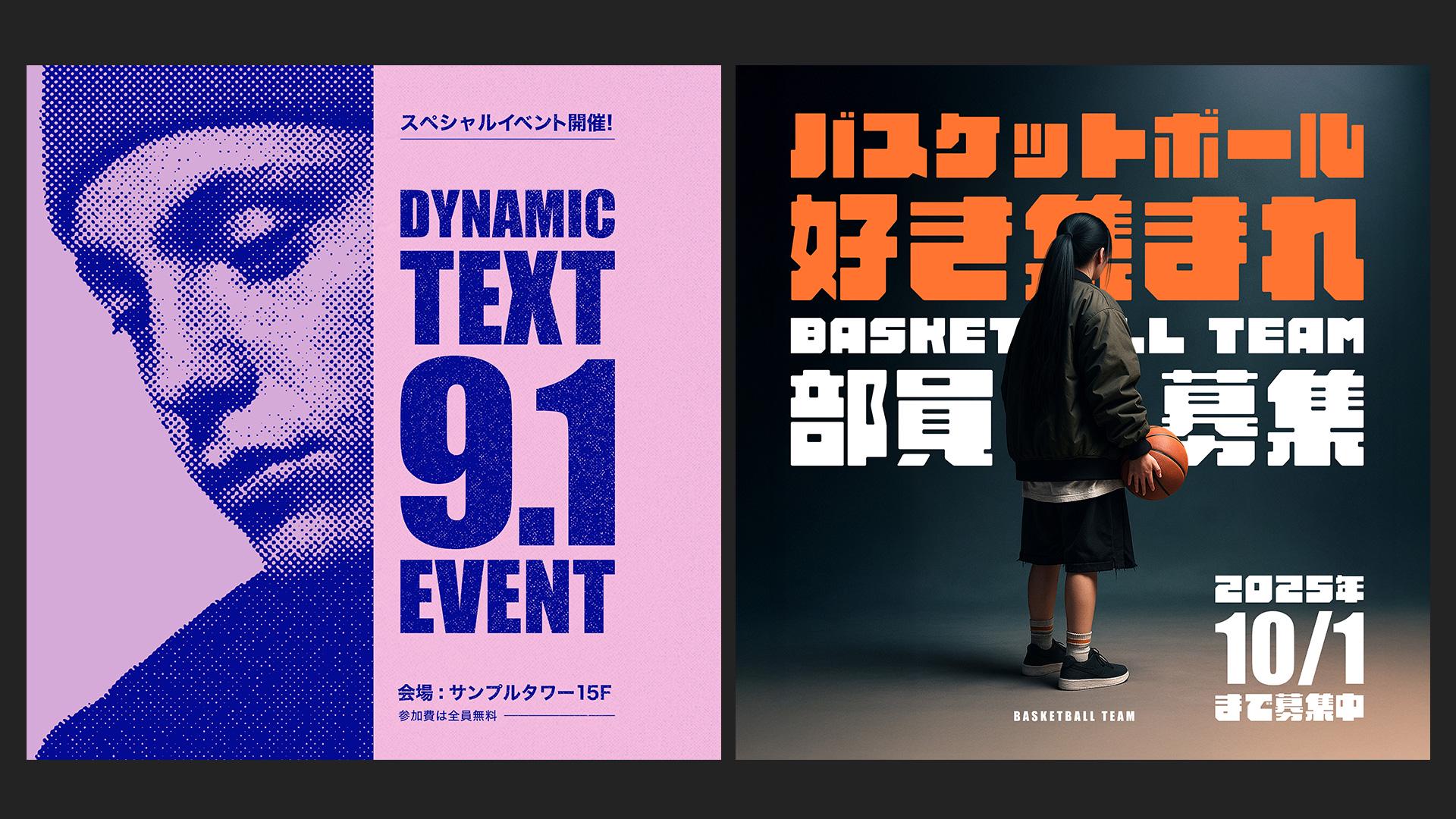 Photoshopの「ダイナミックテキスト」は、テキストボックスのサイズや形状に応じて、文字サイズや改行を自動で調整してくれる機能です。 レイアウトに合わせて文字を無理なく収められるため、SNSバナーやポスターなど、限られたスペースに文字を配置したい場面で特に便利。 これまで手動で調整していた作業が大幅に軽減され、よりスピーディーに美しい仕上がりを目指せます。