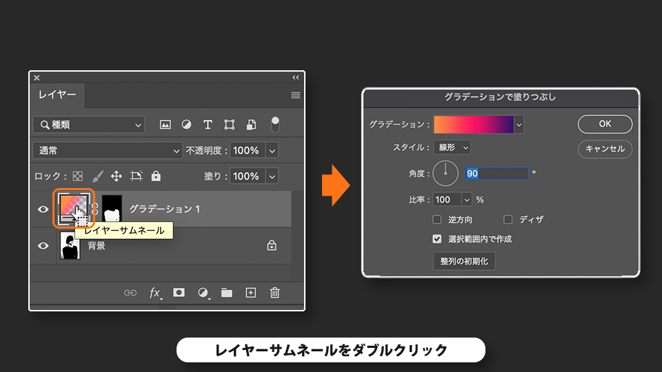 「グラデーションで塗りつぶし」ダイアログボックスを閉じている場合は、レイヤーパネルでグラデーションレイヤーのレイヤーサムネールをダブルクリックすると開きなおすことができます。