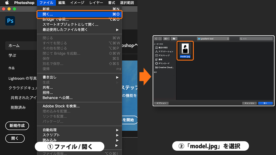 Photoshopを起動し、「ファイル」-「開く」から練習用サンプルファイル「model.jpg」を選択して開きます。