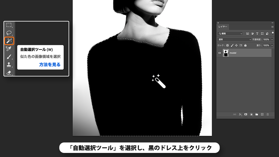 ツールパネルの「自動選択ツール」を選択し、黒のドレス上をクリックします。