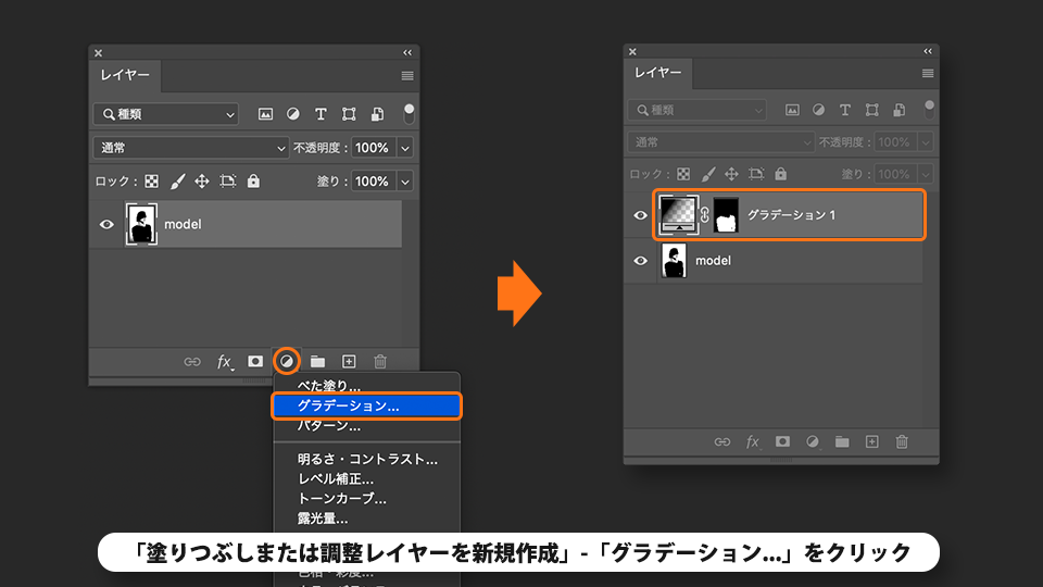 レイヤーパネル下部の「塗りつぶしまたは調整レイヤーを新規作成」-「グラデーション...」を選択します。