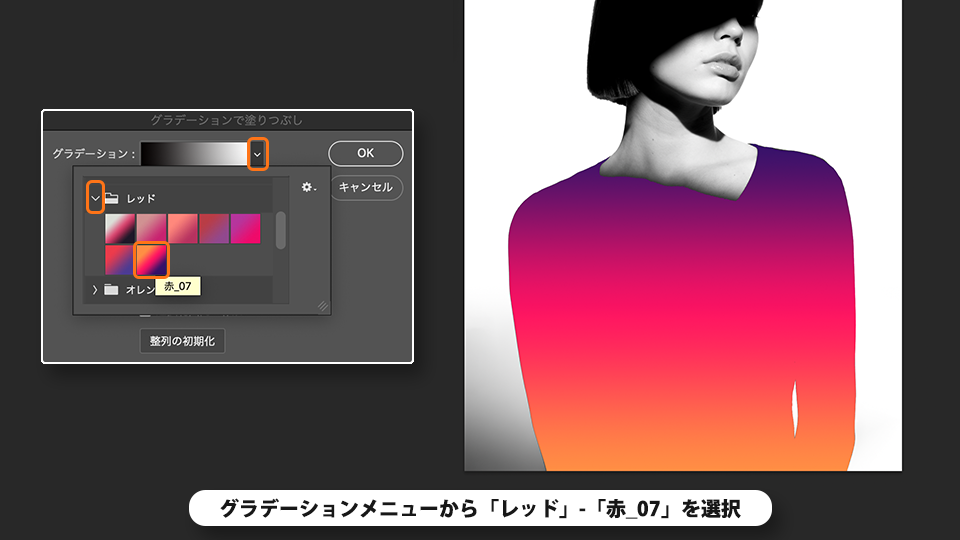 「グラデーション」メニューから「レッド」-「赤_07」を選択します。