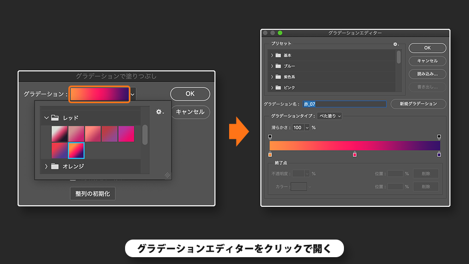 グラデーションのバーをクリックしてグラデーションエディターを開きます。