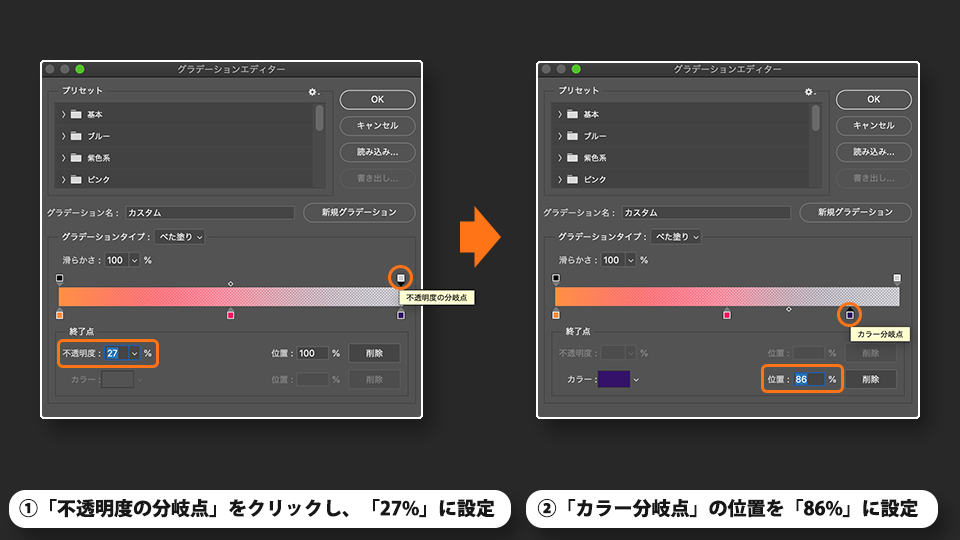 紫の「不透明度の分岐点」をクリックし、不透明度を「27%」に設定します。